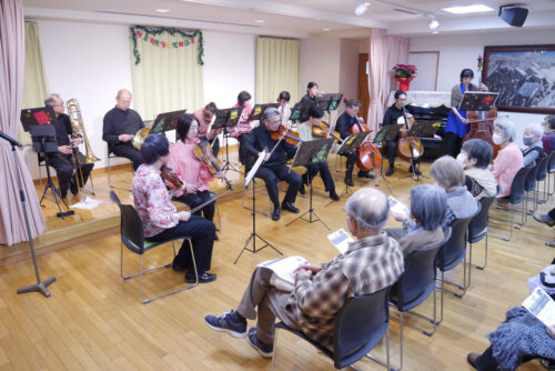 当日は寒い雨の日でしたが、県外から駆け付けて下さった方もいらっしゃり、総勢13名でのコンサートでした。曲目は「フィガロの結婚」序曲(モーツァルト)や「セビリアの理髪師」序曲(ロッシーニ)等、有名なクラシックやクリスマスメドレーなど身近に感じられる曲ばかりで手拍子などで楽しみました。
