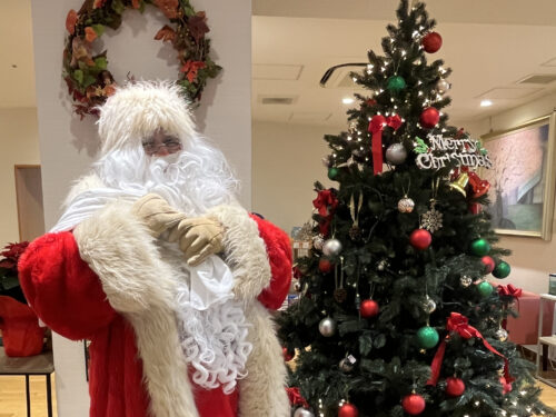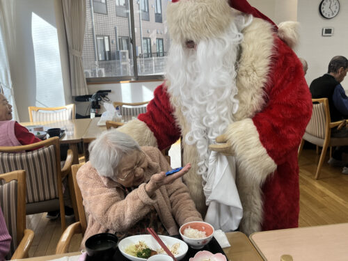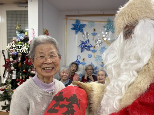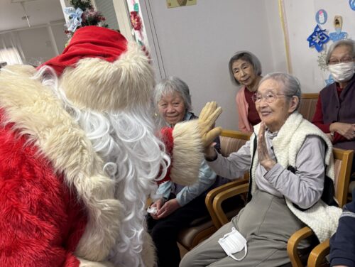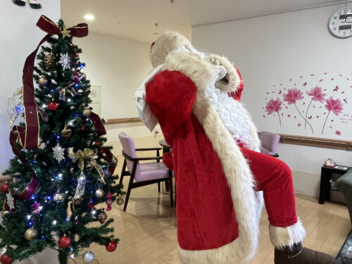12月18日(木)に、今年もあわてんぼう?のサンタクロースさんが麗しの杜にきてくれました。入居者様やデイサービスの利用者様にプレゼントをもってきてくれました。突然のサンタさんの来訪に、皆さんとても驚かれていましたが、1年に1度しか会えないサンタさんに会えて、とても喜ばれていました。来年はいつ来てくれるかな。それまでまた1年、元気に過ごしましょう!