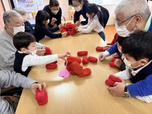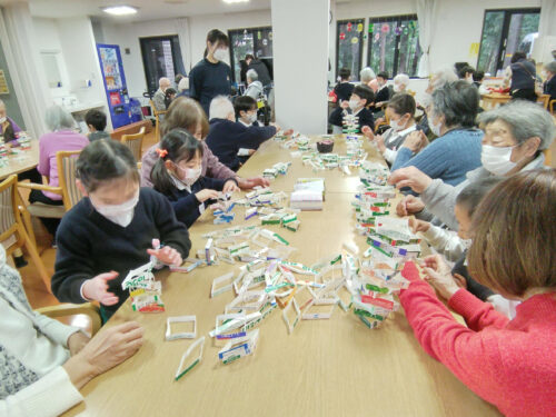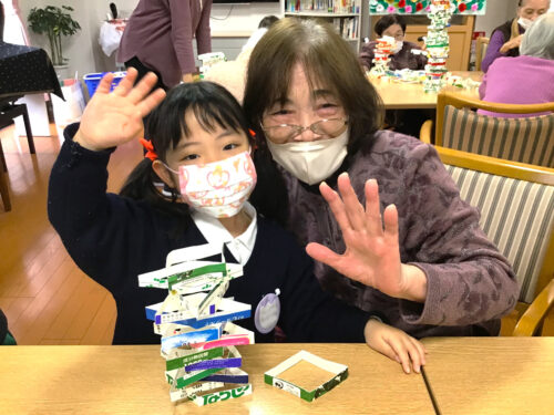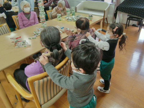 最初は少し緊張気味だった子どもたちですが、入居者の皆様と同じテーブルを囲み、手遊びやゲームが始まるとすぐに打ち解けた様子。 今回は、「牛乳パックジェンガ」「お手玉山くずし」の2種類のゲームを行いました。 子どもたちが「そーっと、そーっと…」と真剣な表情で挑む姿を、入居者の皆様も優しく見守り、成功するたびに大きな拍手と笑い声が沸き起こりました。