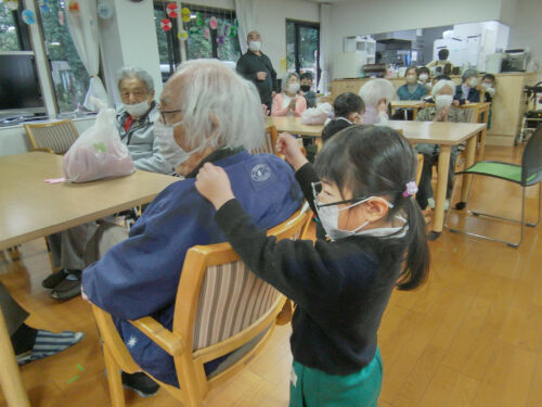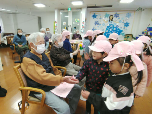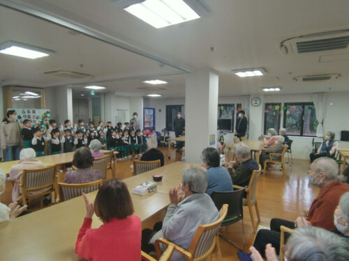 最後には、子どもたちから歌のプレゼントがありました。 一生懸命に練習してきた『やぎさんゆうびん』『北風小僧の寒太郎』の2曲を披露。 子どもたちの明るく伸びやかな歌声に、入居者の皆様も目を細めて聴き入っていらっしゃいました。