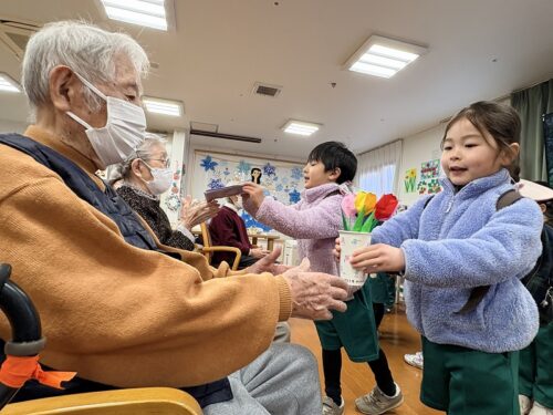 麗しの杜に、元気いっぱいの麗澤幼稚園 年中組の皆さんが交流に来てくれました。 1月20日(火)にはすみれ組、1月22日(木)にはさくら組の皆さんが、寒さを吹き飛ばすような笑顔を届けてくれました。