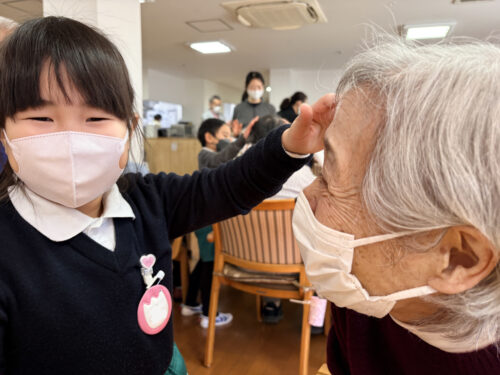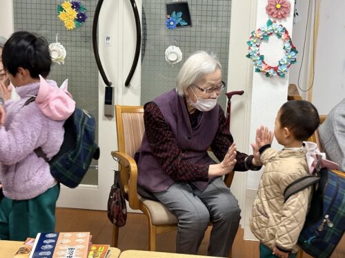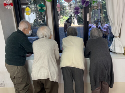 子どもたちの「ゆっくり、優しく」触れ合う姿に、職員一同もとても温かい気持ちになりました。 短い時間ではありましたが、世代を超えて直接触れ合うことで、入居者の皆様にとっても非常に活力となる素敵なひとときとなりました。子どもたちが帰るときには、窓の外をのぞき込んで名残惜しそうに見送る姿が印象的でした。